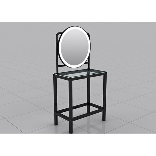 This makeup desk with mirror are black powder coat, countertop tempered glass, the mirror side with led lights . It's used in cosmetics shop . View the black makeup vanity set made in our manufacturer: