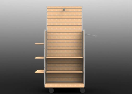 This 4 side slatwall gondola shelving: slatwall panels ( veneer finished or baking finish ), slatwall accessories ( wall hook and slat shelves) , laminated deck, storage cabinet with hinged door (can made with lock), logo, wheels. It's pre-assembled and custom made.