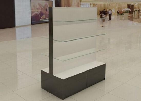 This double sided gondola shelving: glossy black baking paint, laminated deck, glass shelves( or acrylic shelves ), storage cabinet with hinged door (can made with lock), logo. It's pre-assembled and custom made. The gondola shelving are pre-assembled and are made with tempered glass. We offers standard laminate and veneer finishes this gondola with a factory price, and we can also customize finishes to your specification.