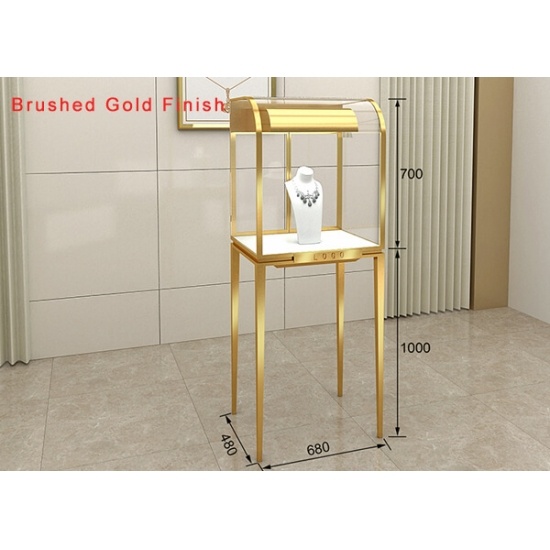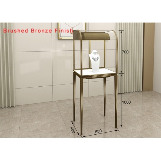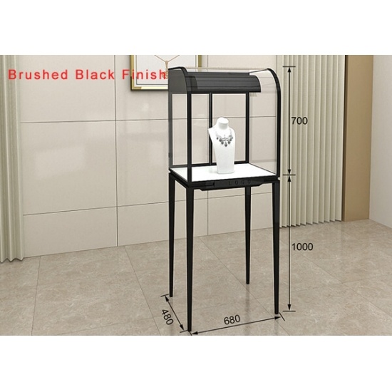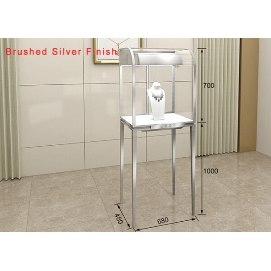 This standard glass jewelry tower is brushed finish stainless steel frame, glass top, with 6 led spotlights, and 4 legs. Inside the jewelry pedestal , it's leather covered or flannelette covered.