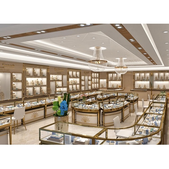 This jewellery showroom is luxury style, main colors are gold and white. The jewellery showroom furniture are pre-assembled and mainly made with tempered glass, gold mirror face stainless steel and MDF.