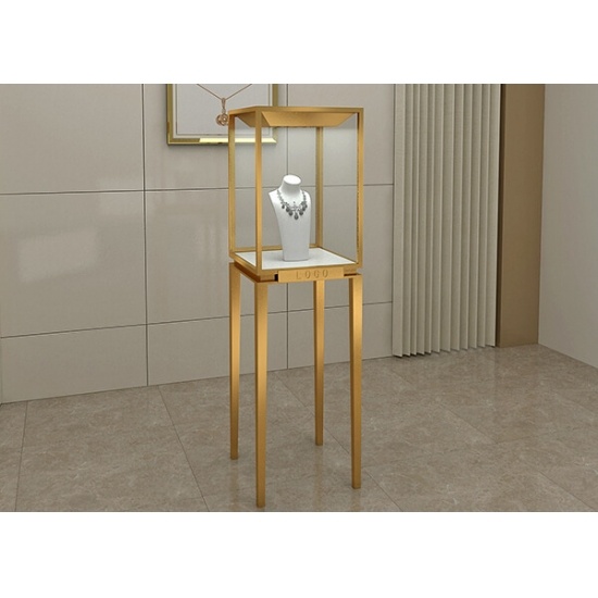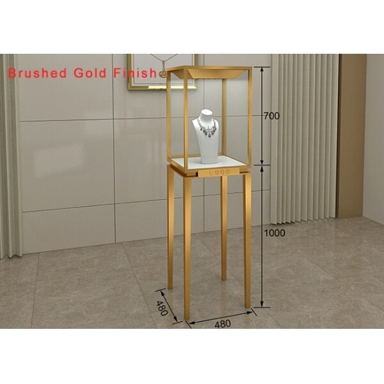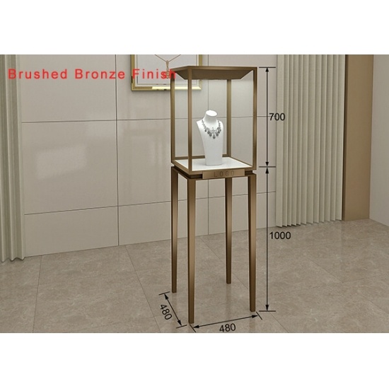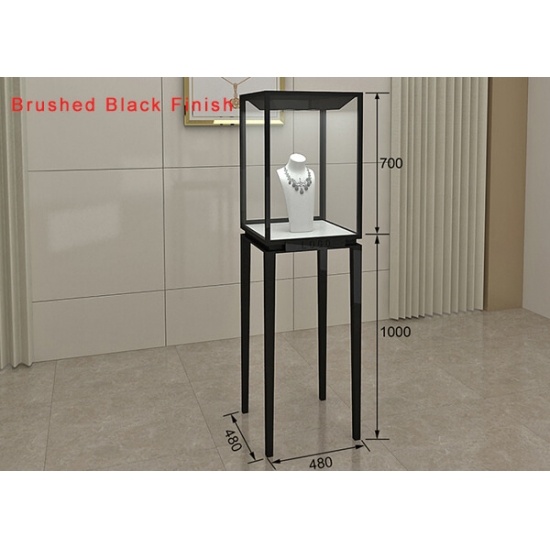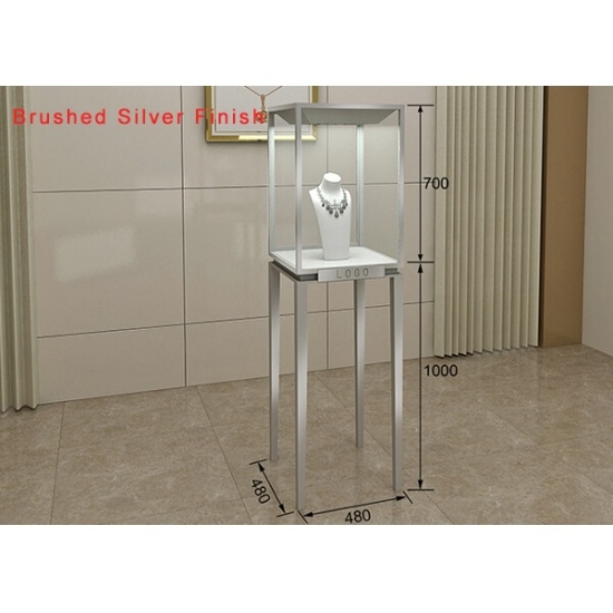 This standard pedestal showcase is brushed finish stainless steel frame, glass top, with 4 led spotlights, and 4 legs. Inside the jewelry pedestal , it's leather covered or flannelette covered.
