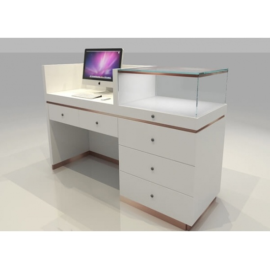 The jewellery shop counter are pre-assembled with underneath storage. It's custom made for USA jewellers project, at May 2019, last 2 months, from design to manufacture finished. The jewellry showcase were made by wooden with white baking paint finished, glass top, rose gold metal frame.