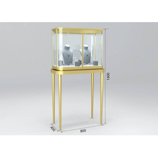 This luxury commercial jewelry display cases is full vision showcase, it's made by brushed finish stainless steel frame, glass cover, with double glass doors, led spotlights, and 4 legs. Inside the jewelry showcase , it's leather covered or flannelette covered. the 4 corners are arcuated.