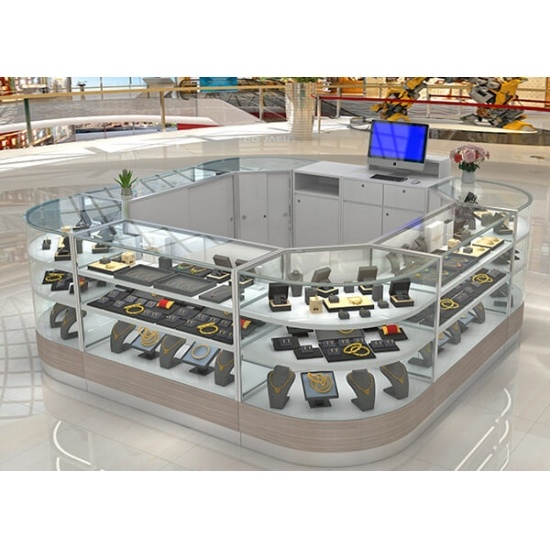 The mall jewelry kiosk displays including three type displays : the rectangular showcase, the curved jewelry corner showcase , the reception desk display. All the jewelry kiosk showcases are 3 layers glass displays, MDF frame with white baking finished and wood veneer.