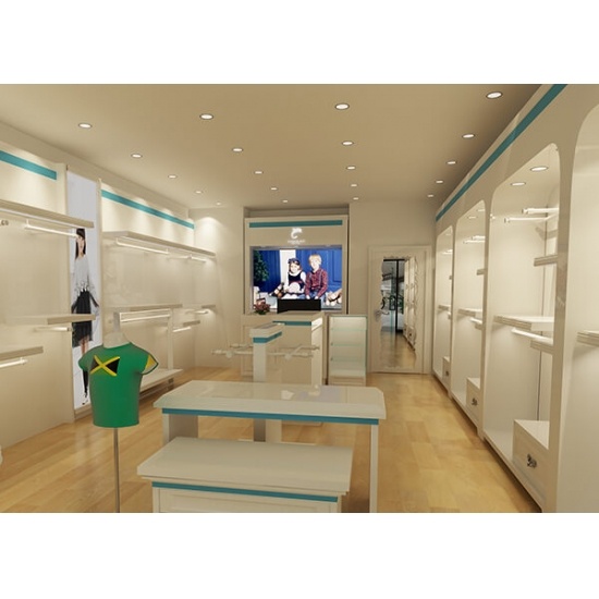 This sbaamiko children clothing shop, we mainly use wooden clothing display racks with white baking paint and blue frame. The wall mounted garment racks were mainly two layer hanger. and in the middle of the shop, we using 2 side clothing gondola.