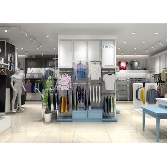 This Dion man clothing shop, we mainly use wall display racks with white baking paint and dark veneer finished , silver stainless steel shelves and displays. the floor standing clothing display racks were white baking paint.