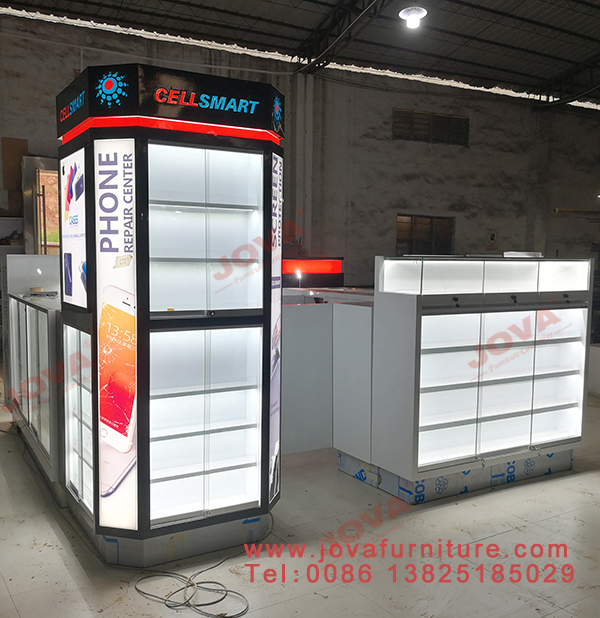 The all the mobile kiosk showcase using sliding glass doors, can be locked. And the top phone showcase was active drawer, to display mobile phone.
