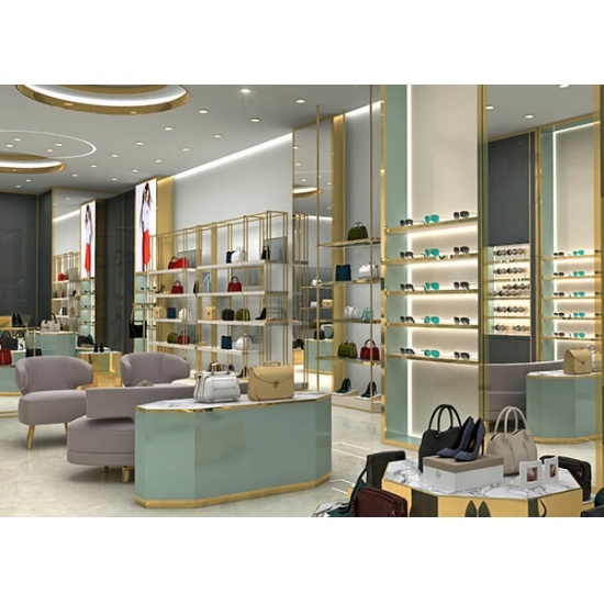 The main materials of this bags shop display are mainly golden stainless steel and marble table top. and the wall face is marble decor. The customized brand LOGO is displayed as customers’ requests. Due to the materials are painting and glass, Easily to clean and maintain.