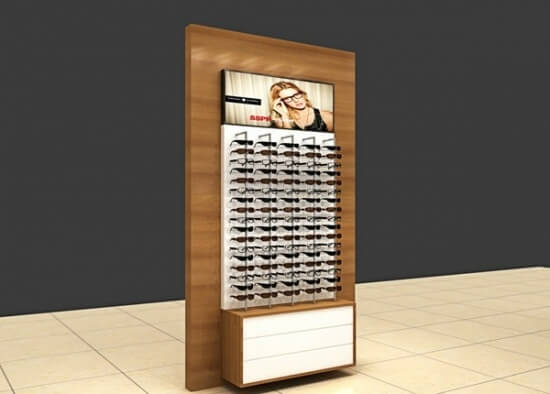 This optical frame display rods: panel ( baking paint or veneer finishes ) , display rods, light box, storage canbinet with hinged door (can lock), mirror, logo, laminated deck, dust resistant, electrical cord with switch.