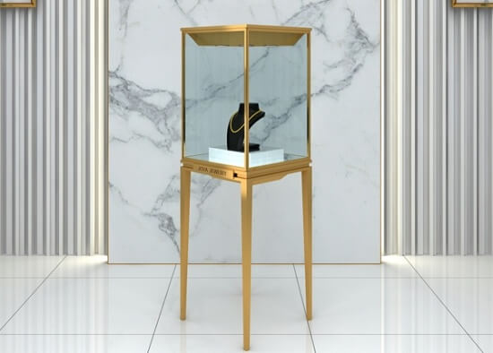 Standard pedestal display case: tempered glass, halogen light strip, clear glass doors, locking hinged door (security lock), stainless steel showcase frame, dust resistant, electrical cord with switch.