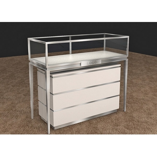 This retail jewelry showcase are stainless steel frame ( color including golden, silver, bronze, white, black, etc), with wooden/MDF storage cabinet / drawers , (can lock). the MDF can be baking finish with white , black , or any color you want , or with wood veneer finish, It's also can be made with stainless steel , with leather covered.