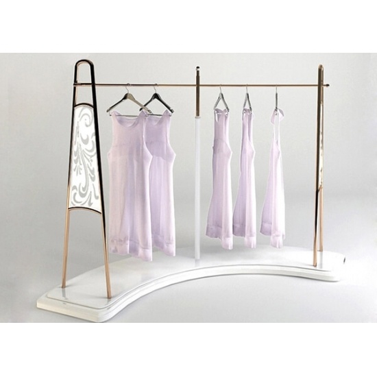 This retail garment display rack is floor standing curved clothing display rack, stainless steel hanger rack and wood pedestal with white baking finished. The standard size is leng 1500mm * deep 400mm * high 1350mm. We can also customize finishes to your specification. our avilable color : golden, silver, black, pink, bronze, rose golden and so on.