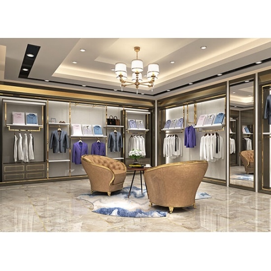 This clothes retail shop was designed for a brand clothes project located in China, at May 2019. They sell menswear and lady's wear products. It mainly using golden stainless steel and wooden with baking finished.