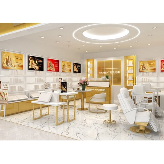 This skin care salon design was made March 2023, for a beauty salon project located in the China. It was modern and practical style, and design by our shop designers. The cosmetic furniture are main white and gold color baking finished .