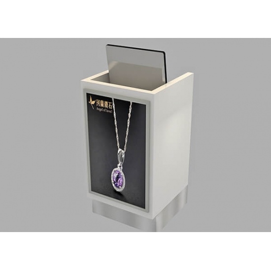 The cash register stand is made by wooden with white baking paint finished, with a light box for advertising picture, metal skirting line. It's design for a jewelry kiosk for UK project.